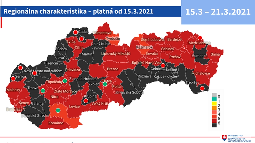Regionálne indikátory pre jednotlivé okresy určujú podrobnejšie rozdelenie do stupňov, kde na základe COVID AUTOMATU platia od pondelka 15.3.2021 pre výnimky zo zákazu vychádzania určené Vládou SR rôzne intervaly testovania (zdroj: www.health.gov.sk).