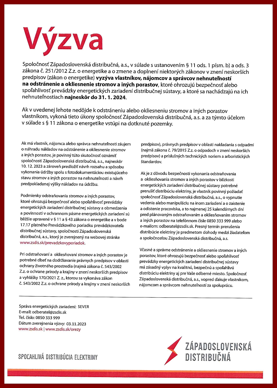 Spoločnosť Západoslovenská distribučná, a.s., vyzýva vlastníkov, nájomcov a správcov nehnuteľností na odstránenie a okliesnenie stromov a iných porastov, ktoré ohrozujú bezpečnosť alebo spoľahlivosť prevádzky energetických zariadení distribučnej sústavy, a ktoré sa nachádzajú na ich nehnuteľnostiach najneskôr do 31. 1. 2024.